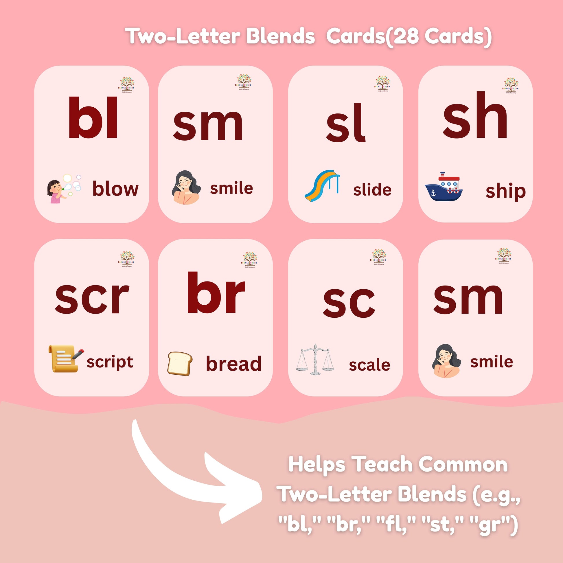 12 Two-Letter Blend Cards: Back to Back printed 24 Blends Featuring common consonant blends like "bl," "br," and "sh," to help children blend sounds and decode words with ease.