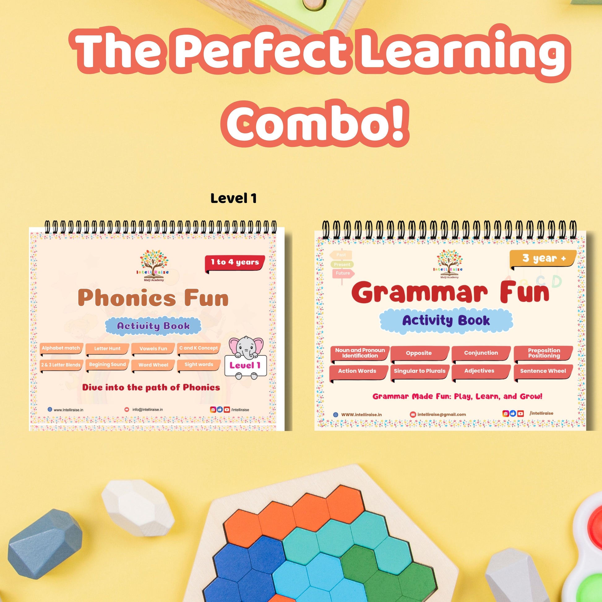 Help your child build a strong foundation in English with this engaging Phonics & Grammar Activity Book Combo designed for early learners (ages 3–7).