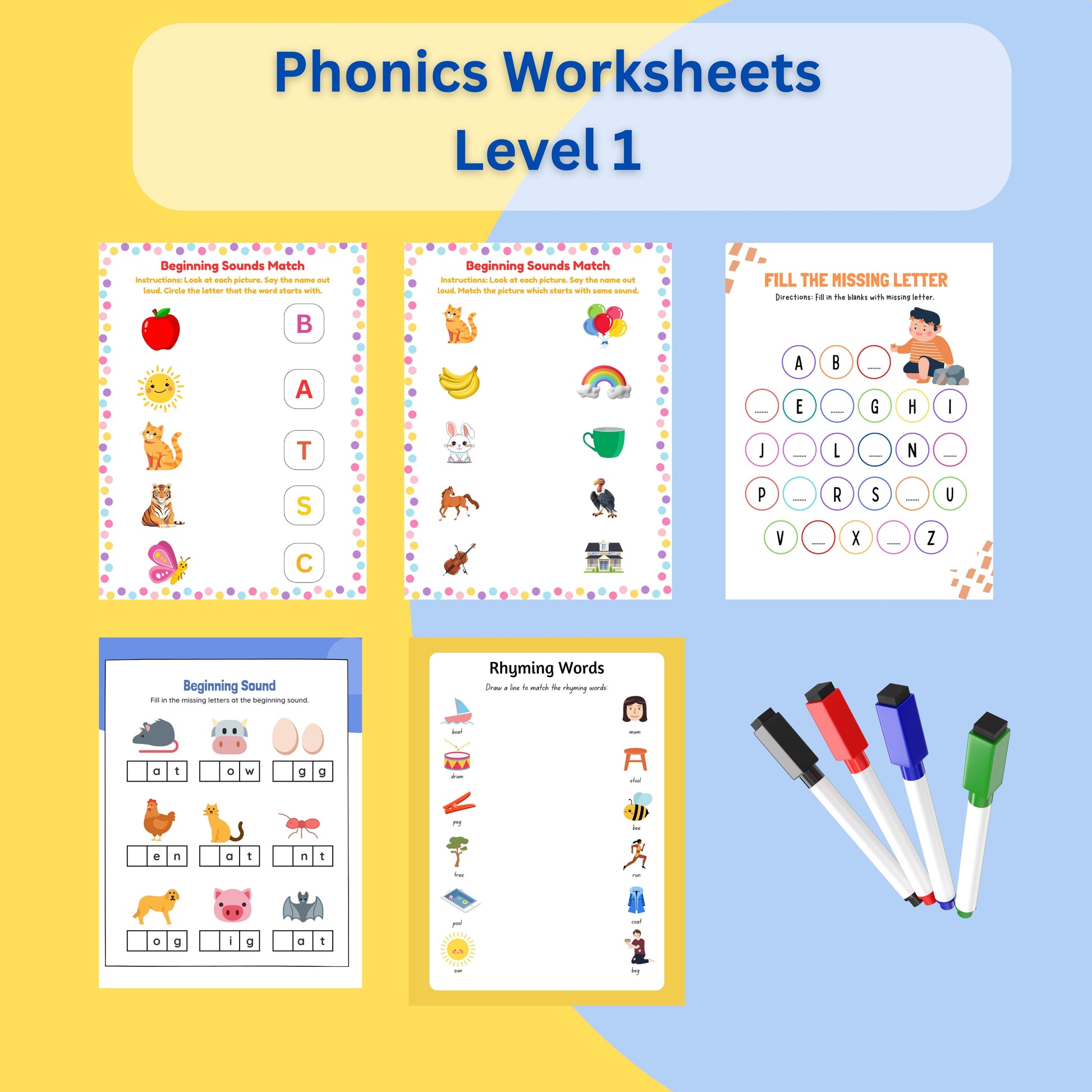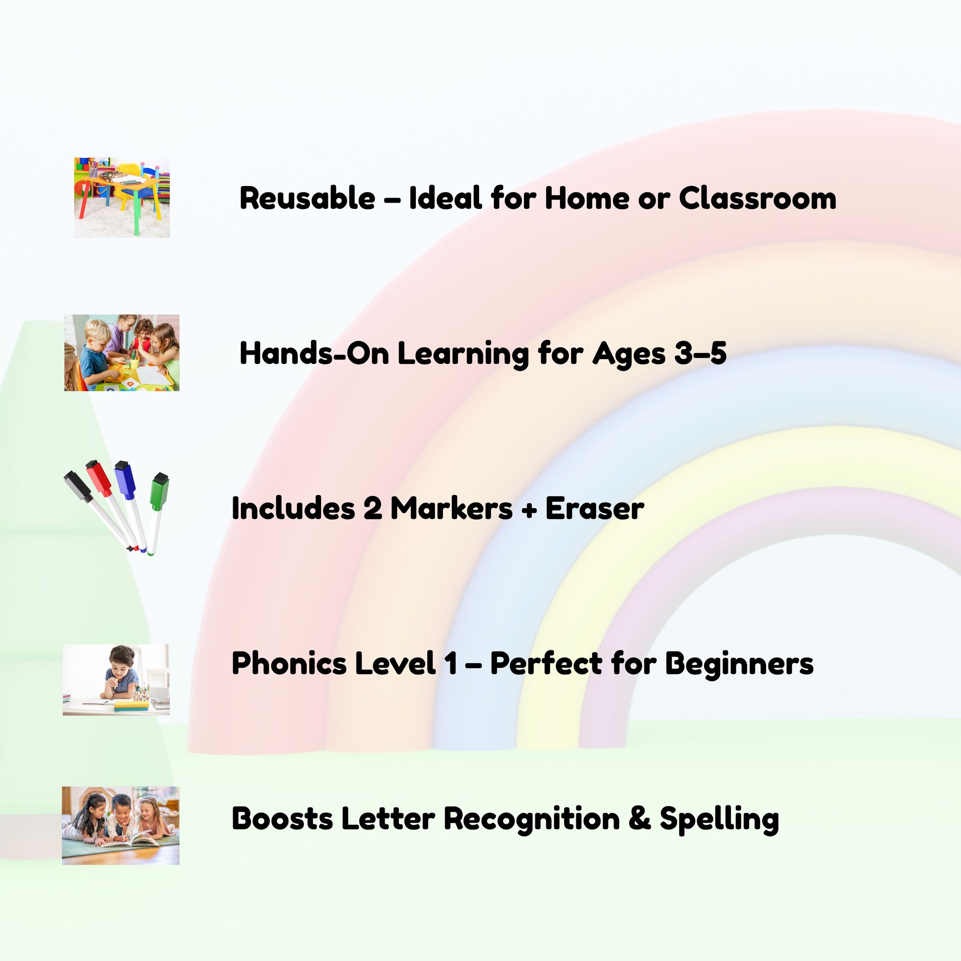 Make early learning fun, mess-free, and effective with our Phonics Level 1 Reusable Worksheets for Toddlers! This engaging set is specially designed for ages 3–5 to build the foundation of reading through hands-on phonics activities.