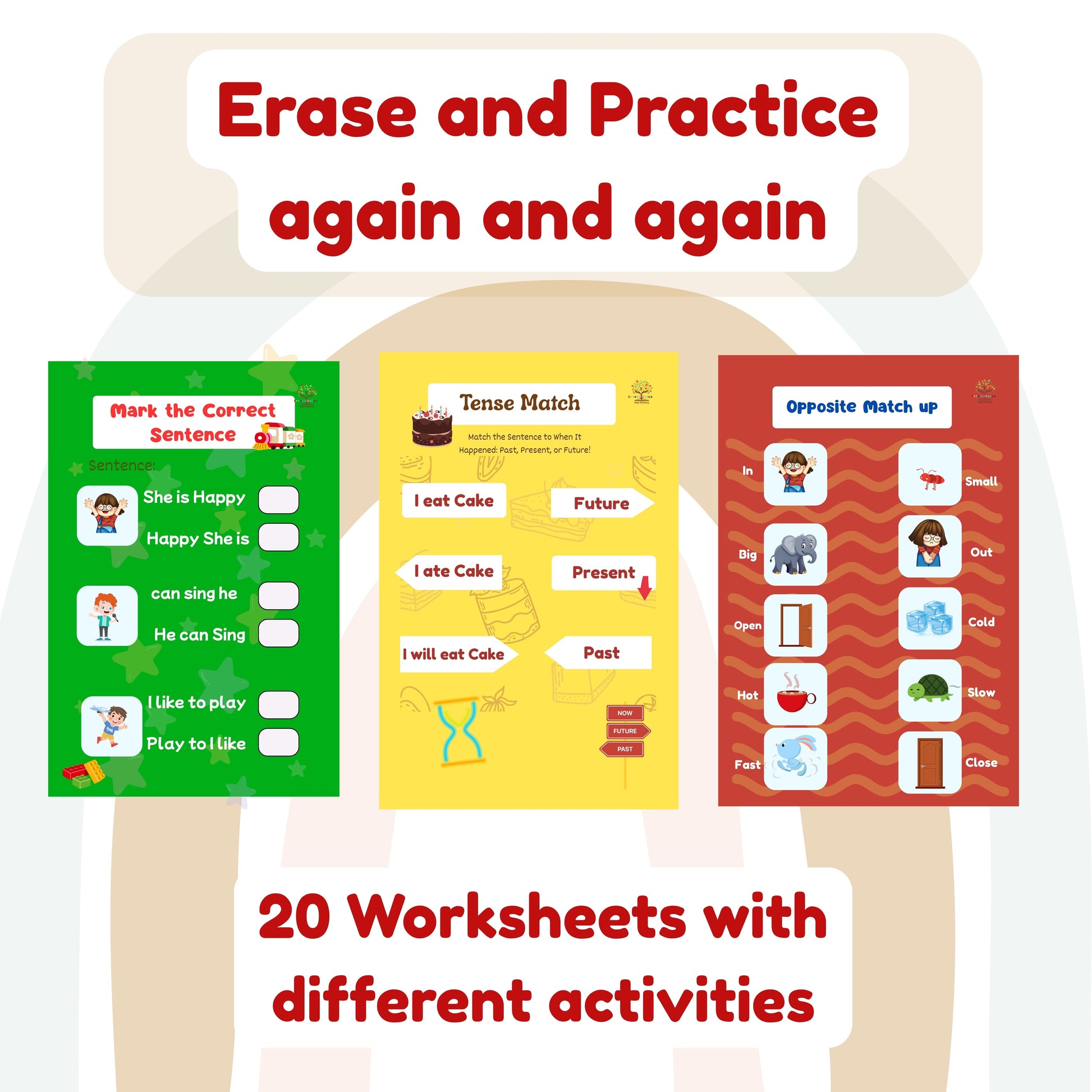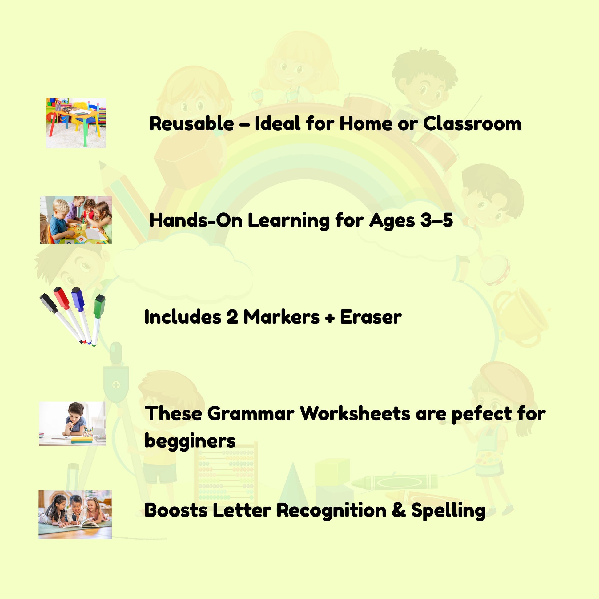 Make grammar practice engaging, reusable, and stress-free! This hands-on learning kit includes thick, laminated grammar worksheets designed for kids to write on, wipe off, and reuse again and again. Whether you're homeschooling, tutoring, or just looking for screen-free learning fun, this set has everything your child needs to build strong grammar skills—without wasting paper.