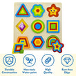 Features various geometric shapes in vibrant colors that fit into matching slots on a sturdy wooden board โ perfect for teaching shape and color recognition.