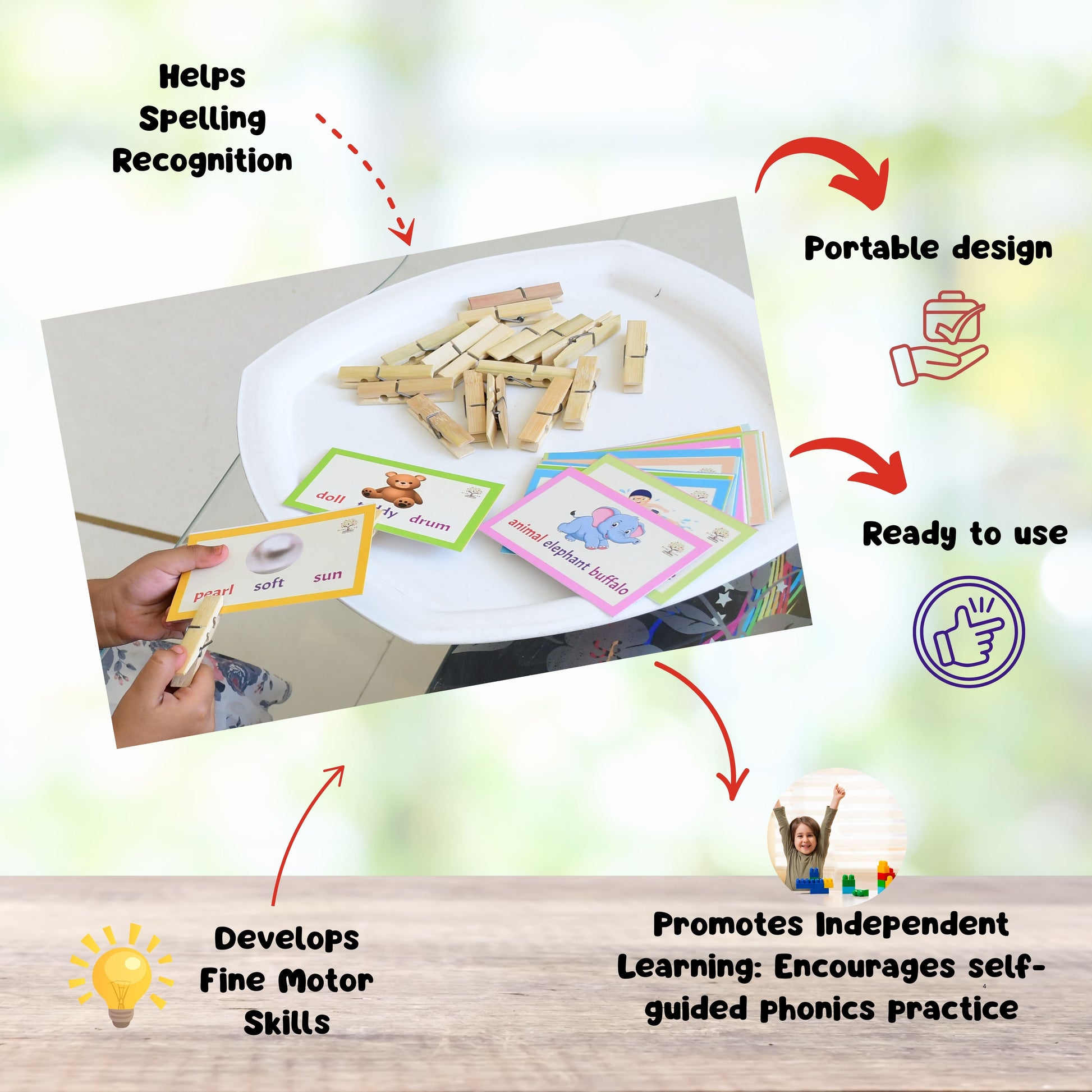Interactive Word Recognition: Includes word cards with three options, allowing children to identify and mark the correct word corresponding to a picture using the included wooden clips.